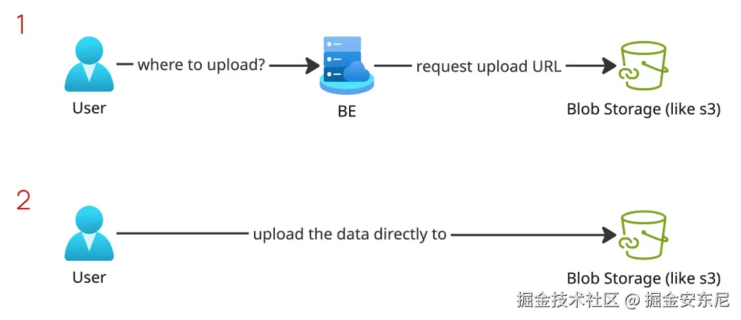 企业级常见做法是使用 S3 / GCS / Azure Blob 等对象存储。关键在于 Signed URL 直传: