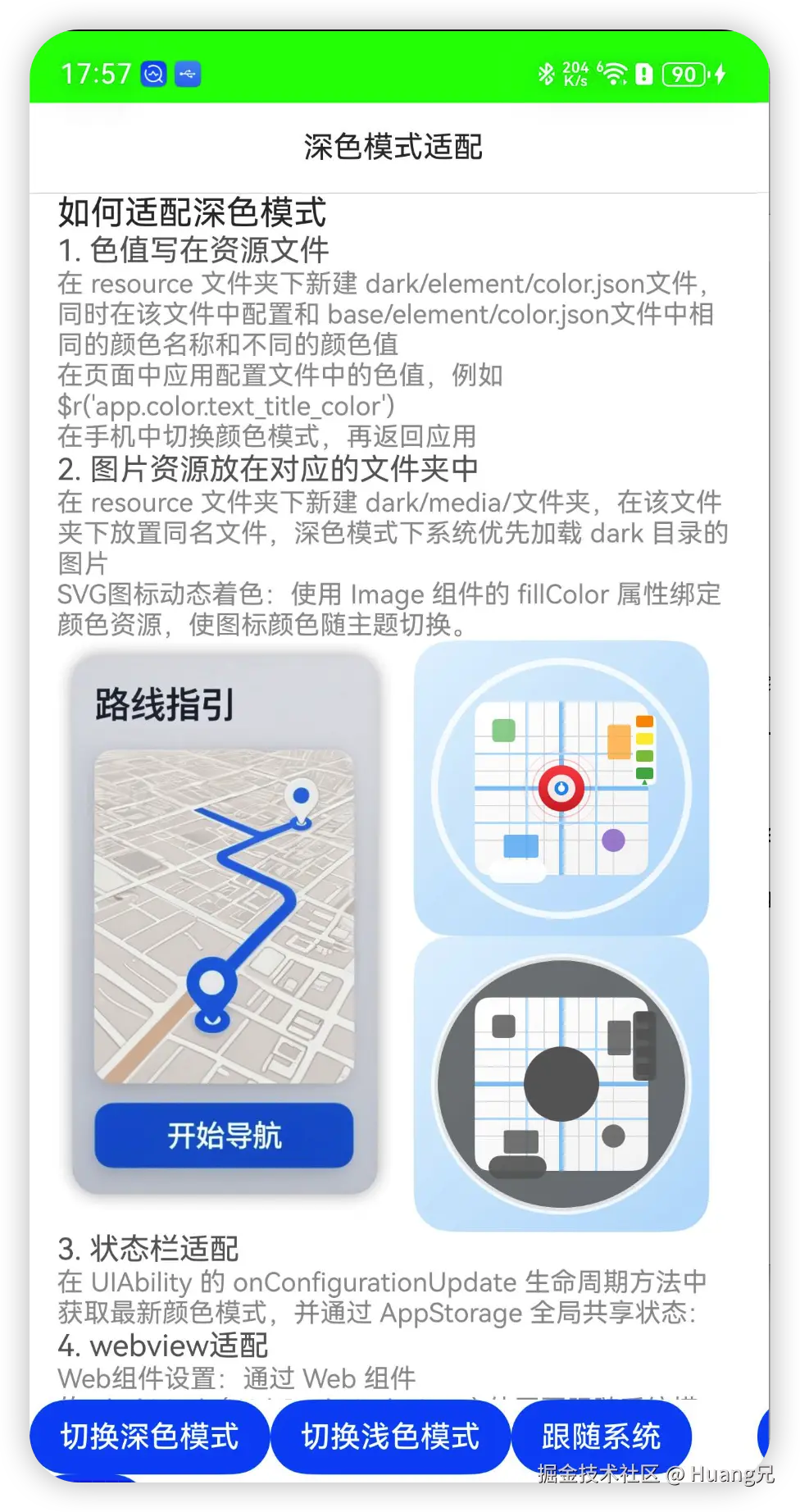 Web组件设置:通过 Web 组件的 .darkMode(WebDarkMode.Auto) 使网页跟随系统模式,或手动设置 .darkMode(WebDarkMode.On/Off)2。 强制深色转换:使用 .forceDarkAccess(true) 对未适配深色的网页进行色值算法转换(需注意部分颜色可能不符合预期)。