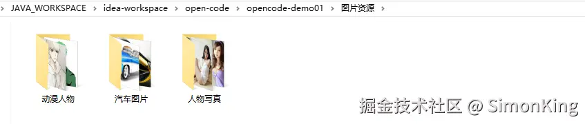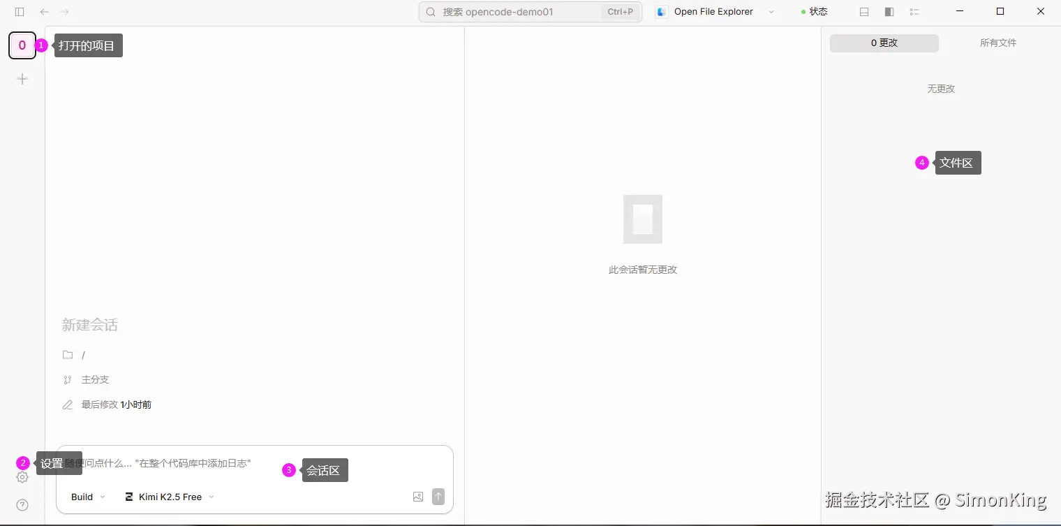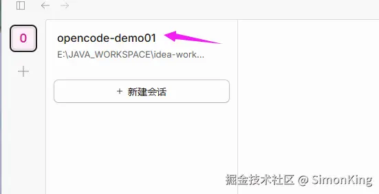 标注①的区域,用来查看项目,鼠标悬浮即可查看。这里我新建了一个工程(文件夹):opencode-demo01