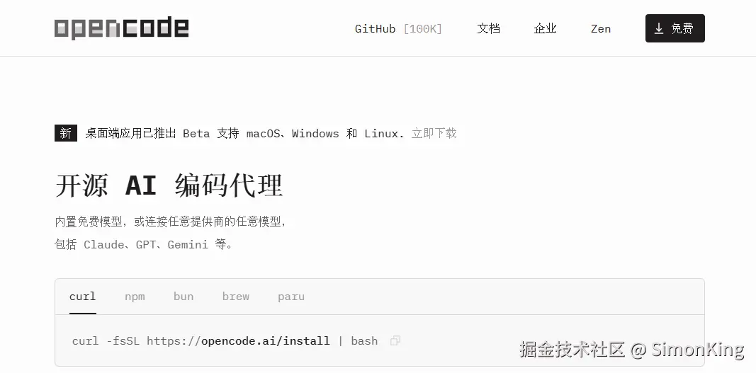 但是其使用的却有一定的门槛。各大IDE工具也纷纷兼容,但是使用仍然有门槛。今天要介绍的这个工具几乎没有门槛,关键模型也可以免费使用:opencode