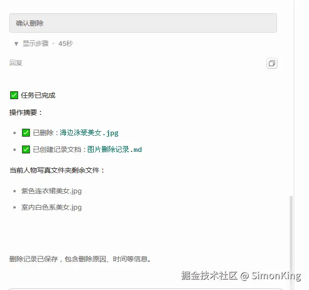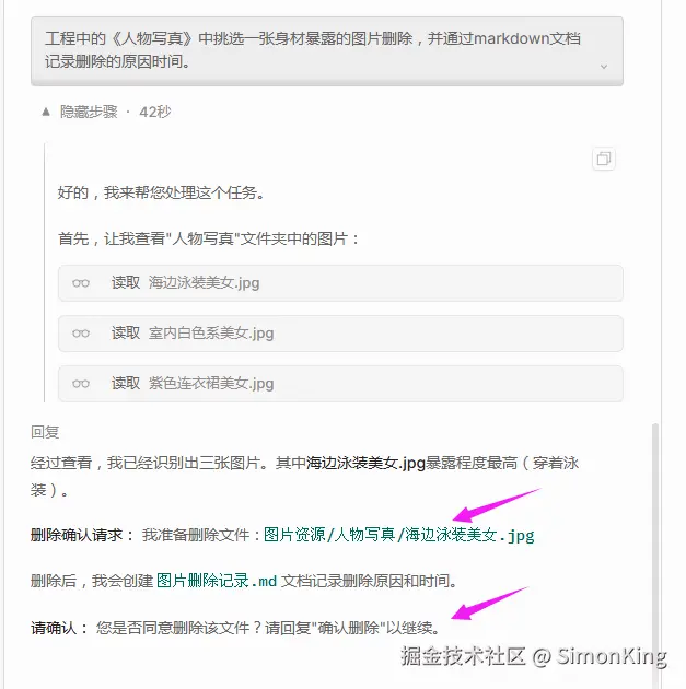 人物写真中有一张图片过于暴露,我想删掉它。是否暴露我们交给AI。删除是危险行为,我们需要让AI删除之前向我们确认。因为完成之后没有明显的提示,所以我们希望完成操作之后能够高亮提示。