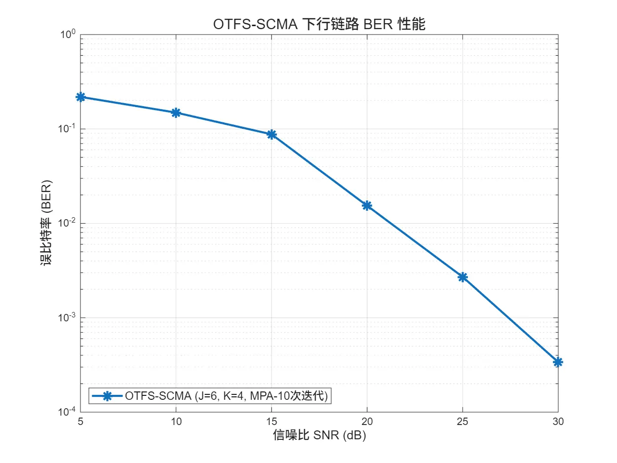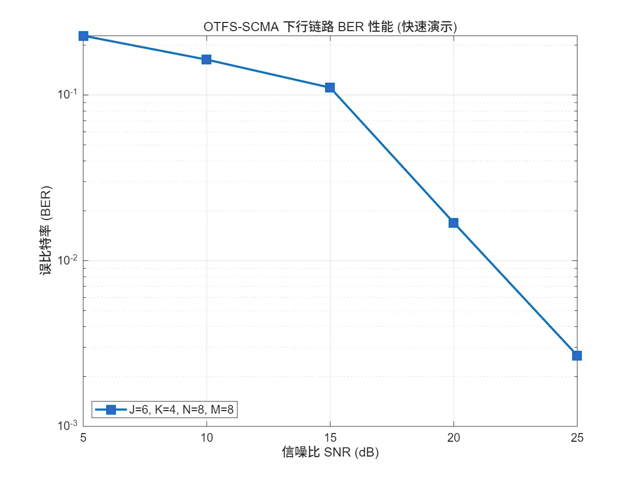 | 🔴 仅有单段算法示例,缺少端到端链路 | ✅ 发送端到接收端全链路闭环:SCMA 编码 →OTFS 调制 → 信道 →MMSE→MPA→BER |