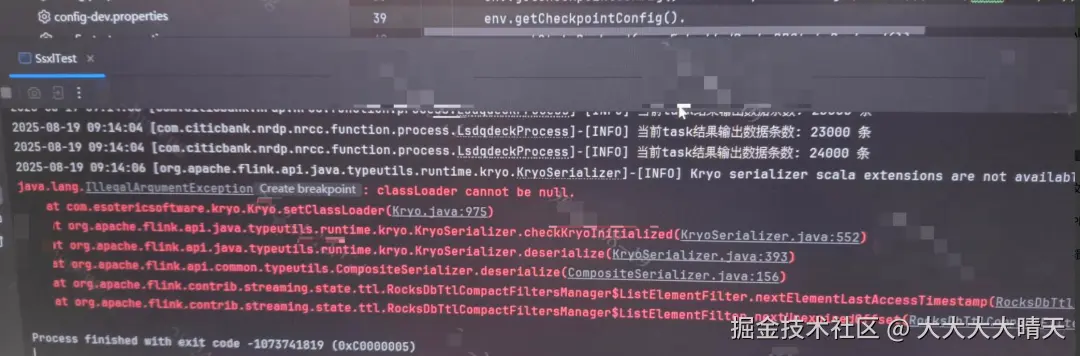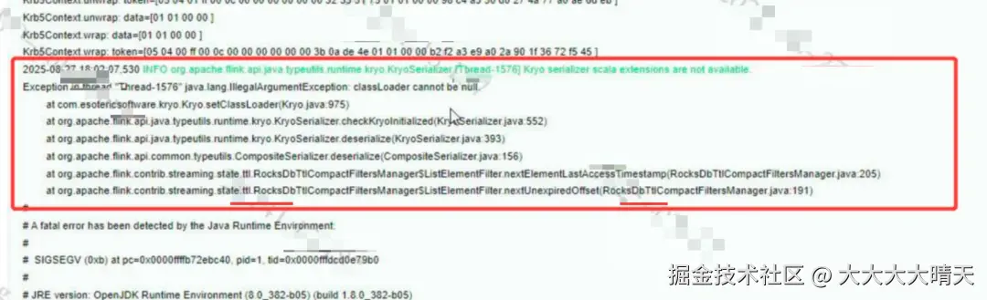 查看其他日志与监控信息暂无明显异常,初步判断问题出在Kryo 序列化器初始化 + RocksDB State TTL 的协同阶段。