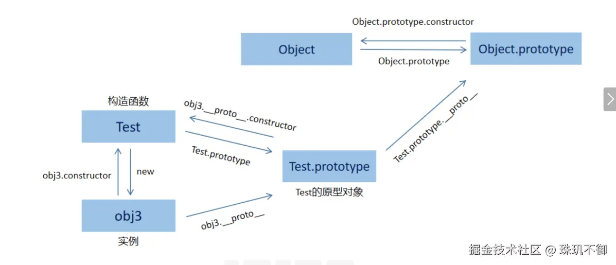 实例的 __proto__ 严格等于其构造函数的 prototype