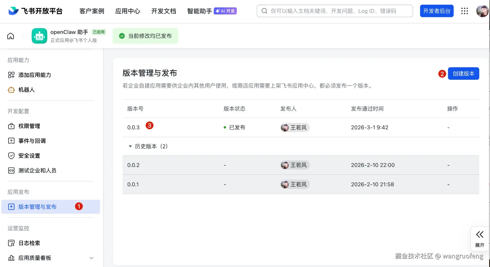 还有,更新配置后,记得在飞书后台重新发布一个新版本,配置才能生效。我这里创建了 0.0.3 版本。
