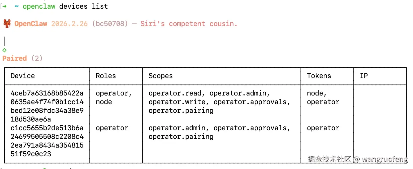 执行 openclaw devices list