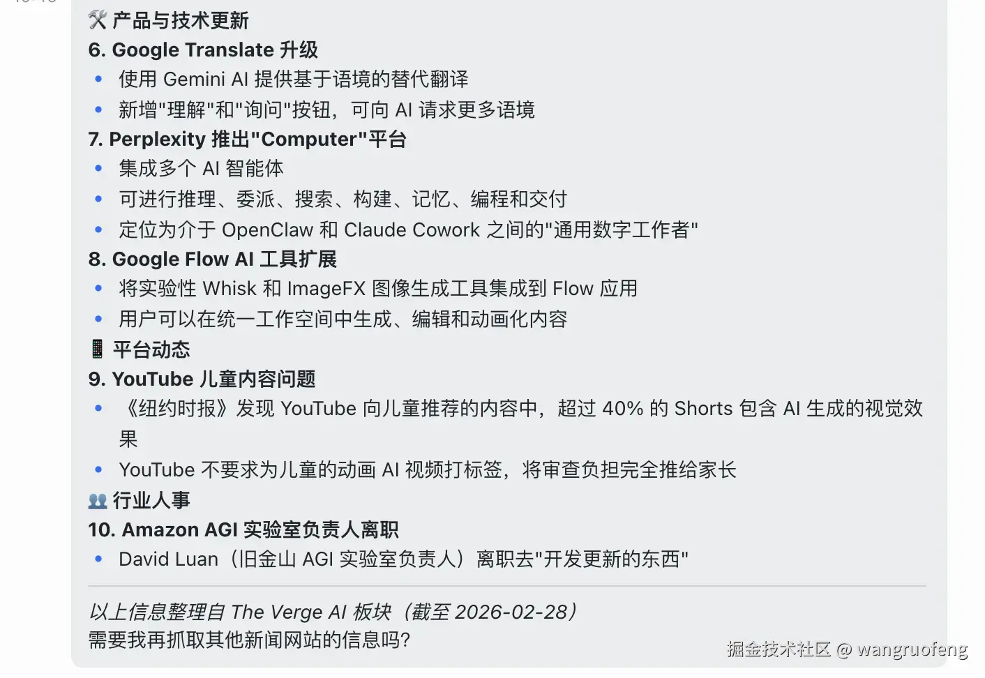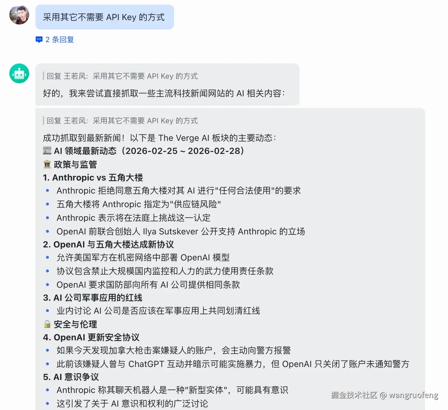 我尝试让它采用不用 key 的方式,它帮我找到了 10 条资讯,下面是前 1~5 条