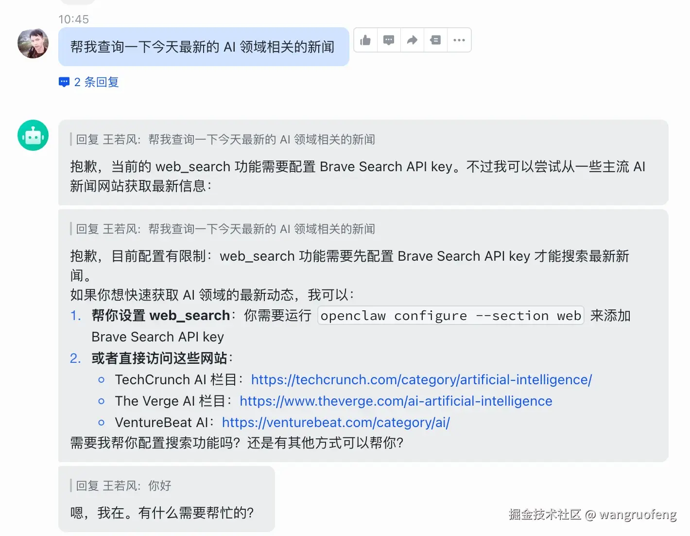 让它帮我搜索一下 AI 领域的最新相关新闻,它提示需要 key