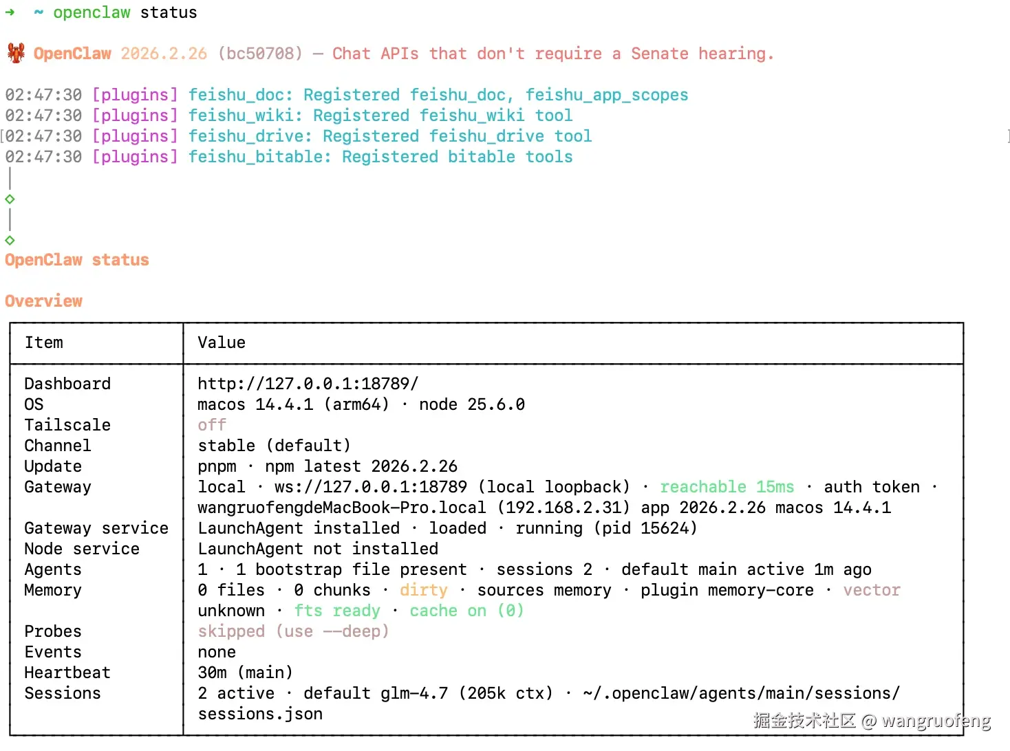 执行 openclaw status