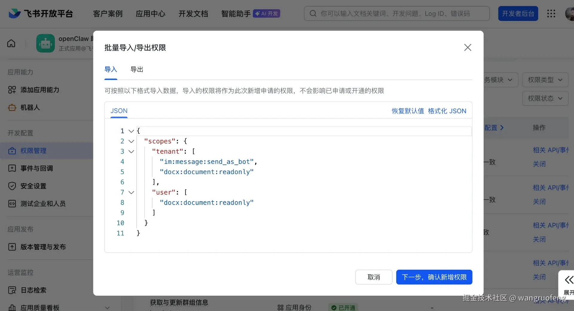 好消息是,从最终结果来看,飞书机器人那边( open.feishu.cn/app)的配置基本没太... JSON: