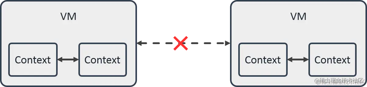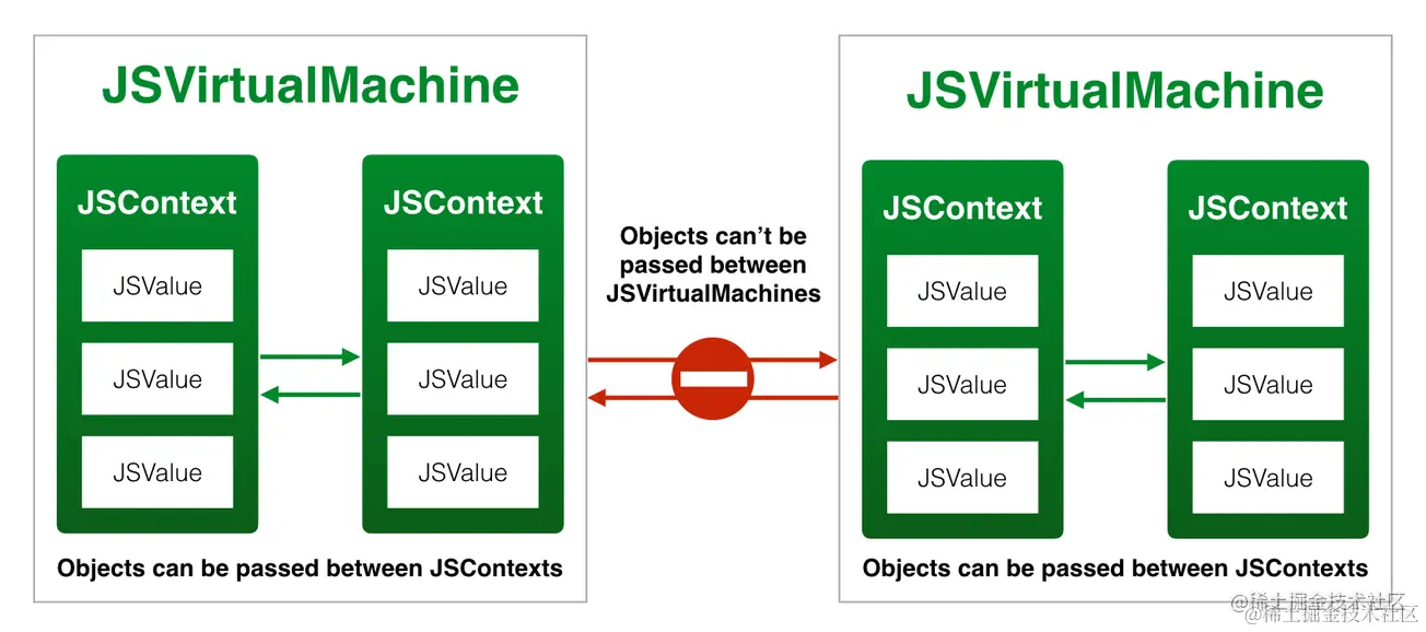 同一 JSVirtualMachine 下多个 JSContext 可共享、传递 JSValue;不同 VM 之间不能传递 JSValue [3]。