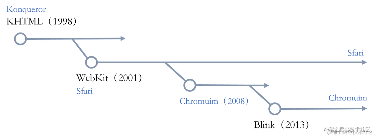 现在使用WebKit的主要两个浏览器Sfari和Chromium(Chorme的开源项目)。WebKit起源于KDE的开源项目Konqueror的分支,由苹果公司用于Sfari浏览器。其一条分支发展成为Chorme的内核,2013年Google在此基础上开发了新的Blink内核。