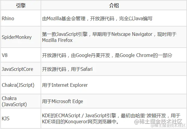 - 下图是当前主要的还在开发中的JavaScript引擎