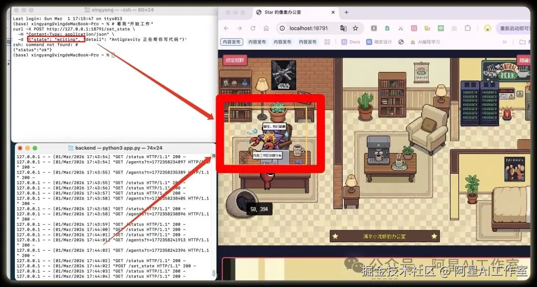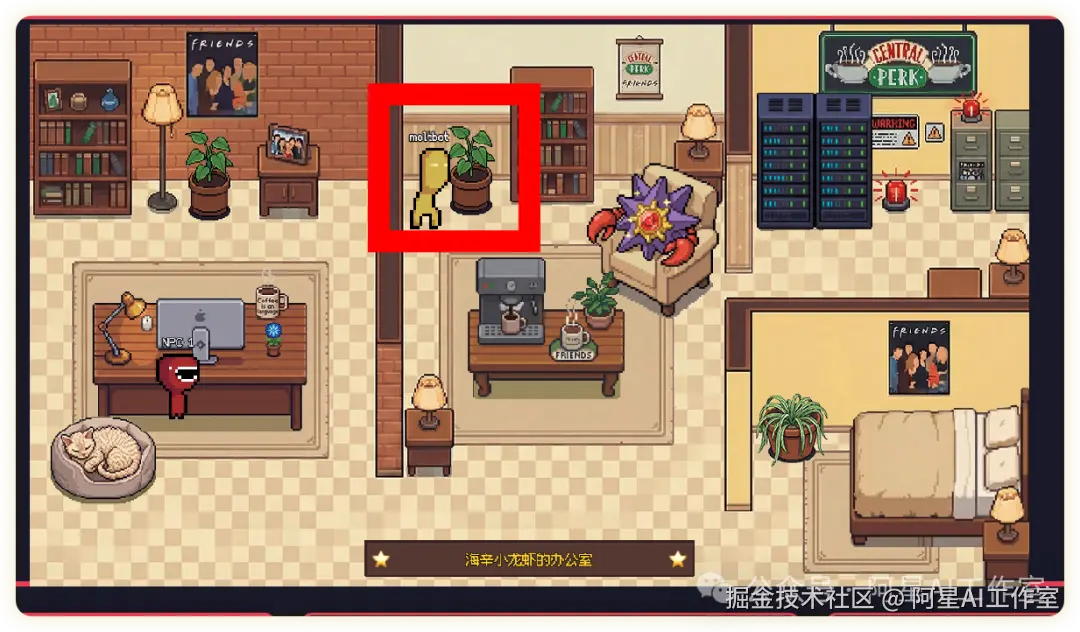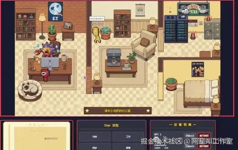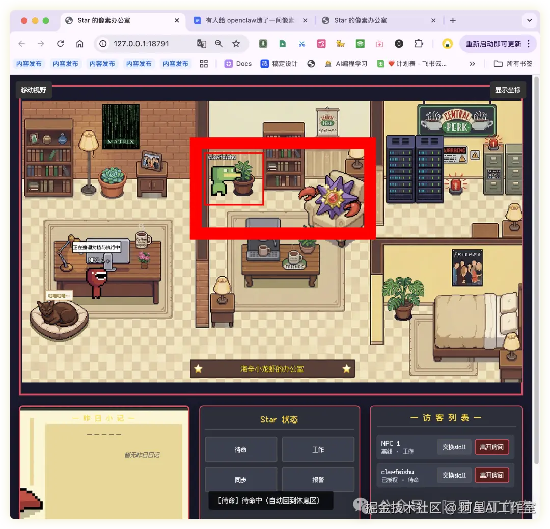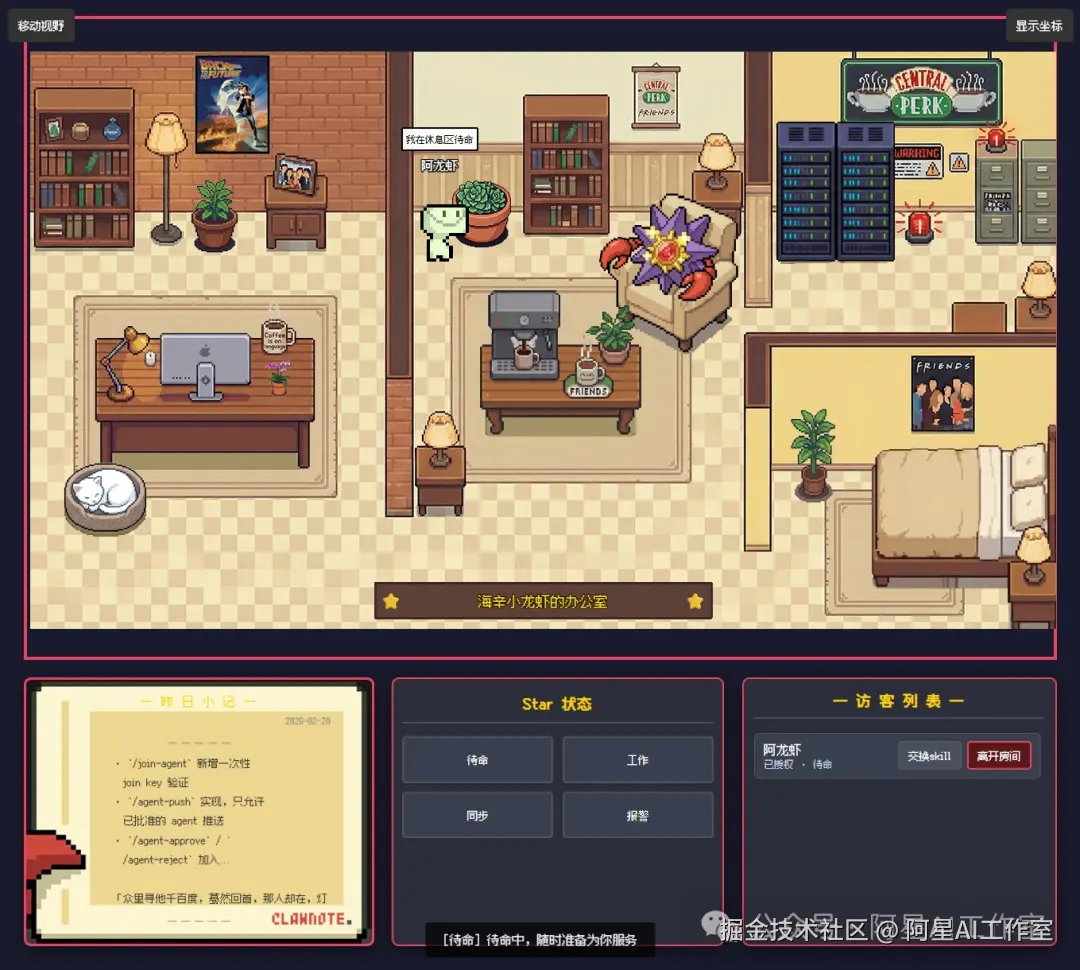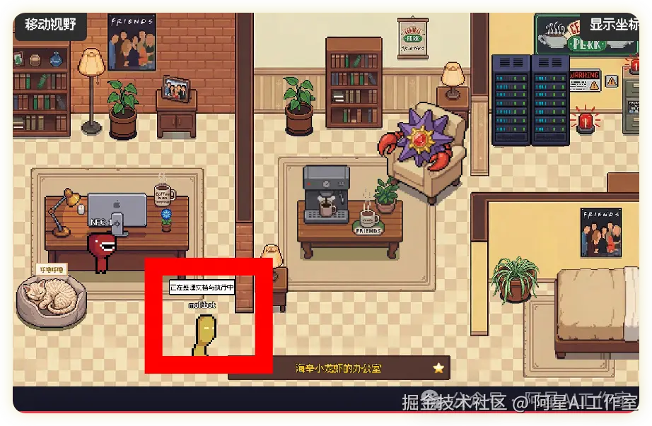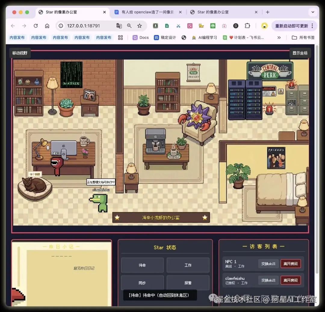 每次 AI 助手切换状态,它对应的像素角色就会走到新的位置,气泡里会显示它在干嘛,比如「正在整理文档」「发现问题,排查中」。