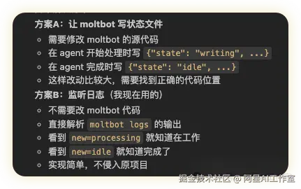 需要你写状态文件:1、可以是让openclaw(moltbot)写,找到 moltbot 处理消息的核心代码(可能在 src/agent/ 或 src/commands/agent.ts)在 agent 开始处理任务时,写入状态文件: