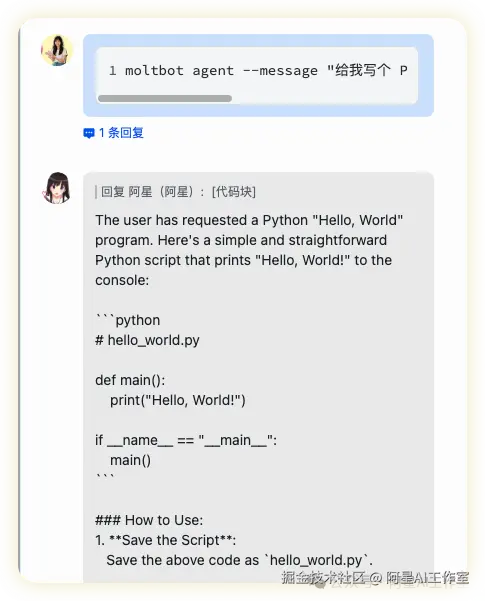 moltbot agent --message "给我写个 Python 的 hello world" --session-id test-$(date +%s)