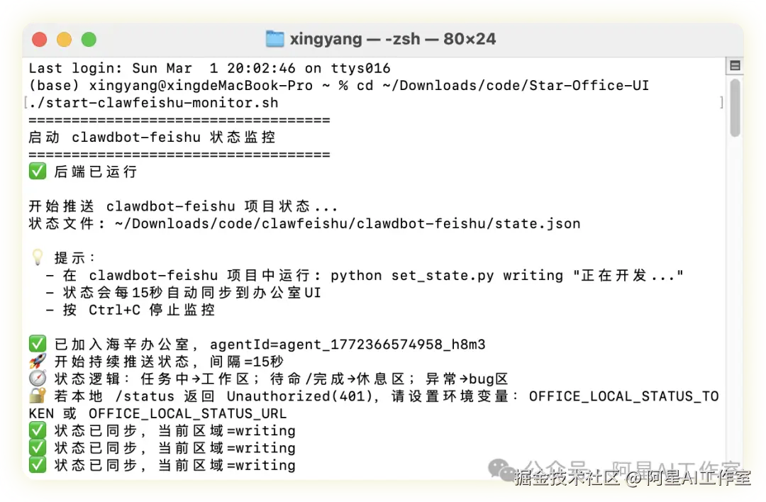 原本的 Star Office UI 项目里有一个 office-agent-push.py,但那个脚本是通过读取状态文件(state.json)来获取状态的。问题是我 moltbot 并没有写这个状态文件。
