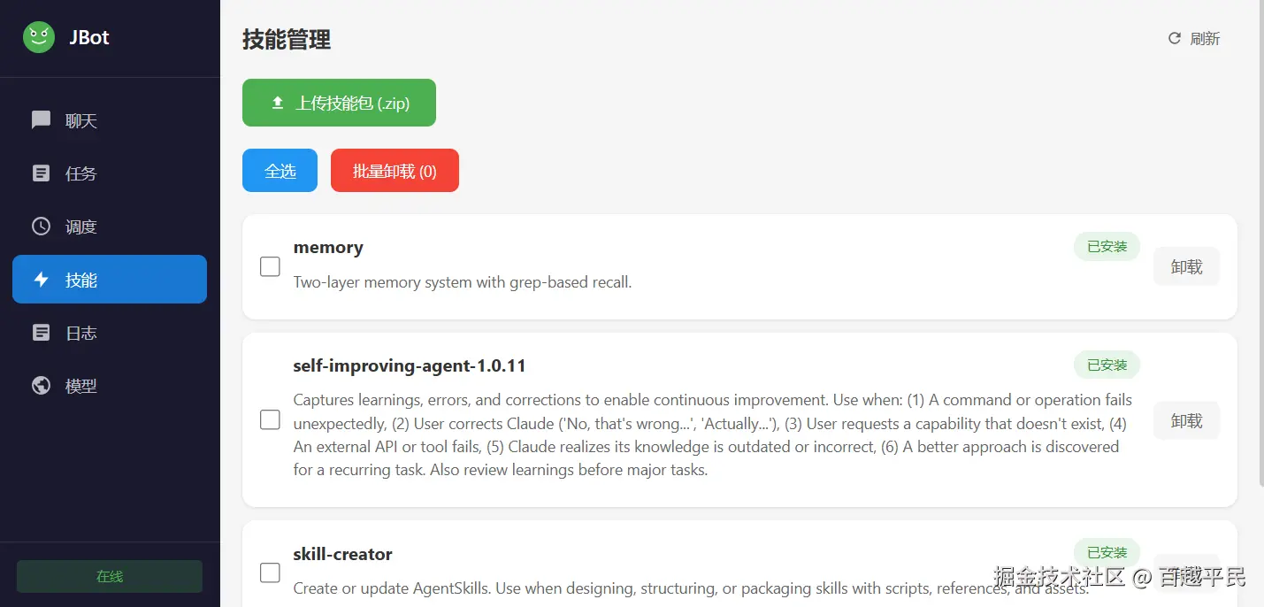 - 技能管理:动态注册、禁用或更新工具函数,无需重启服务。可通过文件存储工具定义,运行时动态加载。