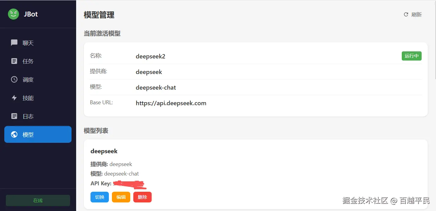 - 模型管理:配置可用的 LLM 模型列表(API Key、端点、参数),切换后需要重启服务。