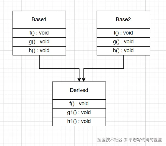 接下来我们看看多重继承的情况,我们假设一个子类继承了两个基类: