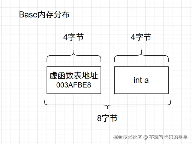 因为含虚函数的类对象必须容纳至少一个虚指针(vptr),它占4字节(64位,因编译器不同可能是8字节),且受对齐影响可能插在开头或中间。