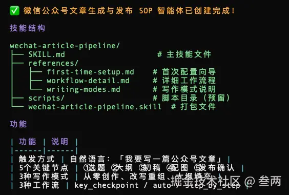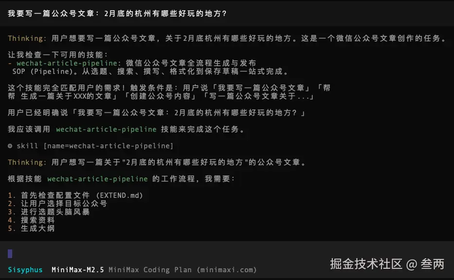 很简单,把以上SKILL.md复制到opencode对话框中,它会自己给你构建一个 wechat-article-pipeline的skills。(用的模型是minmax-M2.5)