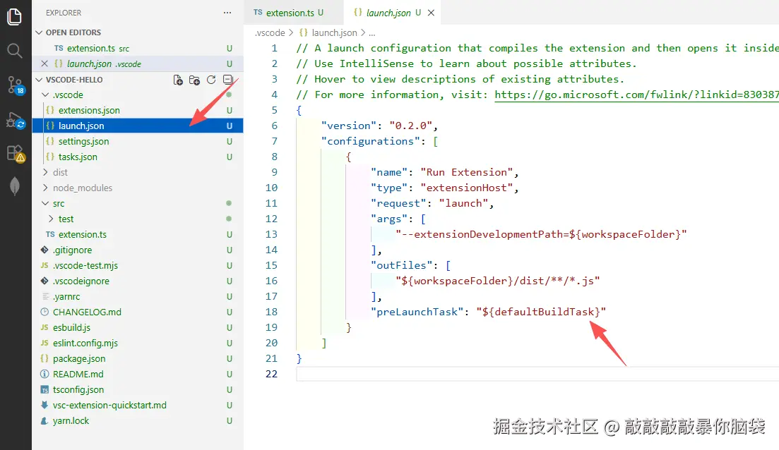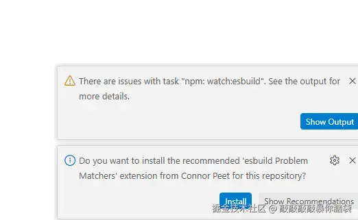 首次运行Debug vscode插件会提示有问题,原因是因为launch.json配置了预运行的任务"preLaunchTask": "${defaultBuildTask}",即在tasks.json里面配置的预运行任务,其中有个npm: watch:esbuild的任务有问题。