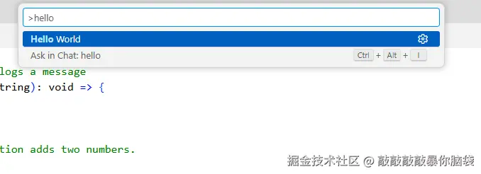 package.json配置命令,可以通过Ctrl+Shift+P唤起vscode命令栏搜索命令名称Hello World