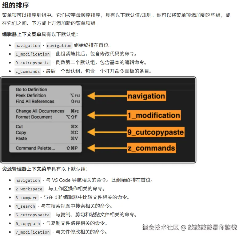 如果想将菜单放在别的地方或者别的分组group,可以查看官方文档contributes.menus的配置 vscode.js.cn/api/referen...