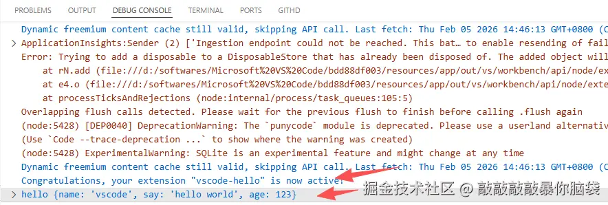 同时我们也能在vscode-hello项目的DEBUG CONSOLE调试控制台看到相关的输出打印