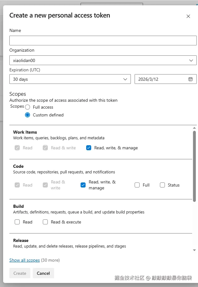 登录Azure DevOps创建个人访问令牌,记得复制令牌token字符串
