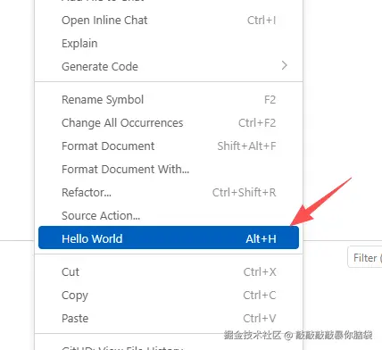 可以直接通过右击菜单的Hello World或者Alt+H快捷键触发helloWorld命令