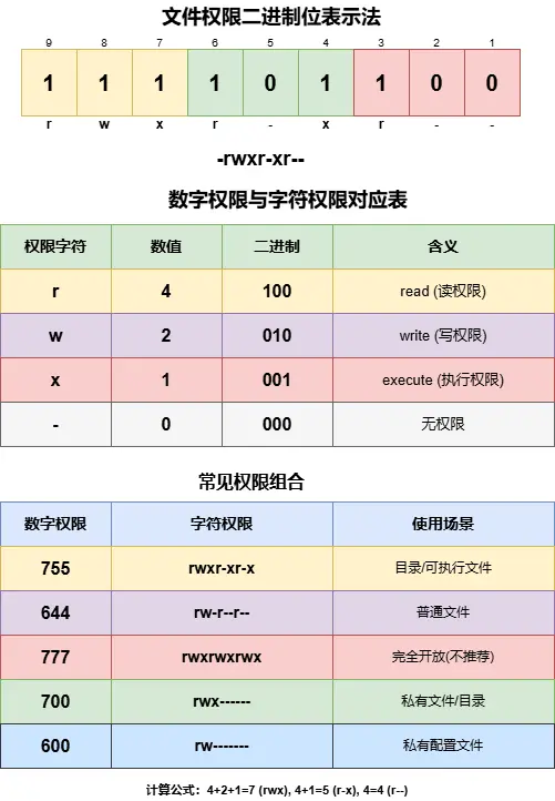 rwx就是 4+2+1=7,代表全权限rw-是 4+2+0=6,代表可读可写但不可执行r-x是 4+0+1=5,代表可读可执行但不可写r--是 4+0+0=4,代表只有读权限 这样一来,三组权限就对应三个数字,组合起来就是我们熟悉的权限码了。比如chmod 755 filename,就是给所有者设 7(rwx),所属组和其他人都设 5(r-x),对应字符权限就是-rwxr-xr-x,这也是脚本文件的标准权限 ------ 既能让所有人运行,又不让别人随便修改,符合最小权限原则。 那chmod除了数字法,还有符号法可以微调权限,比如你只想给所有者加个执行权限,就用chmod u+x filename;想去掉所属组的写权限,就用chmod g-w filename。符号法的好处是不用记全权限,只改你需要的部分,适合小范围调整。