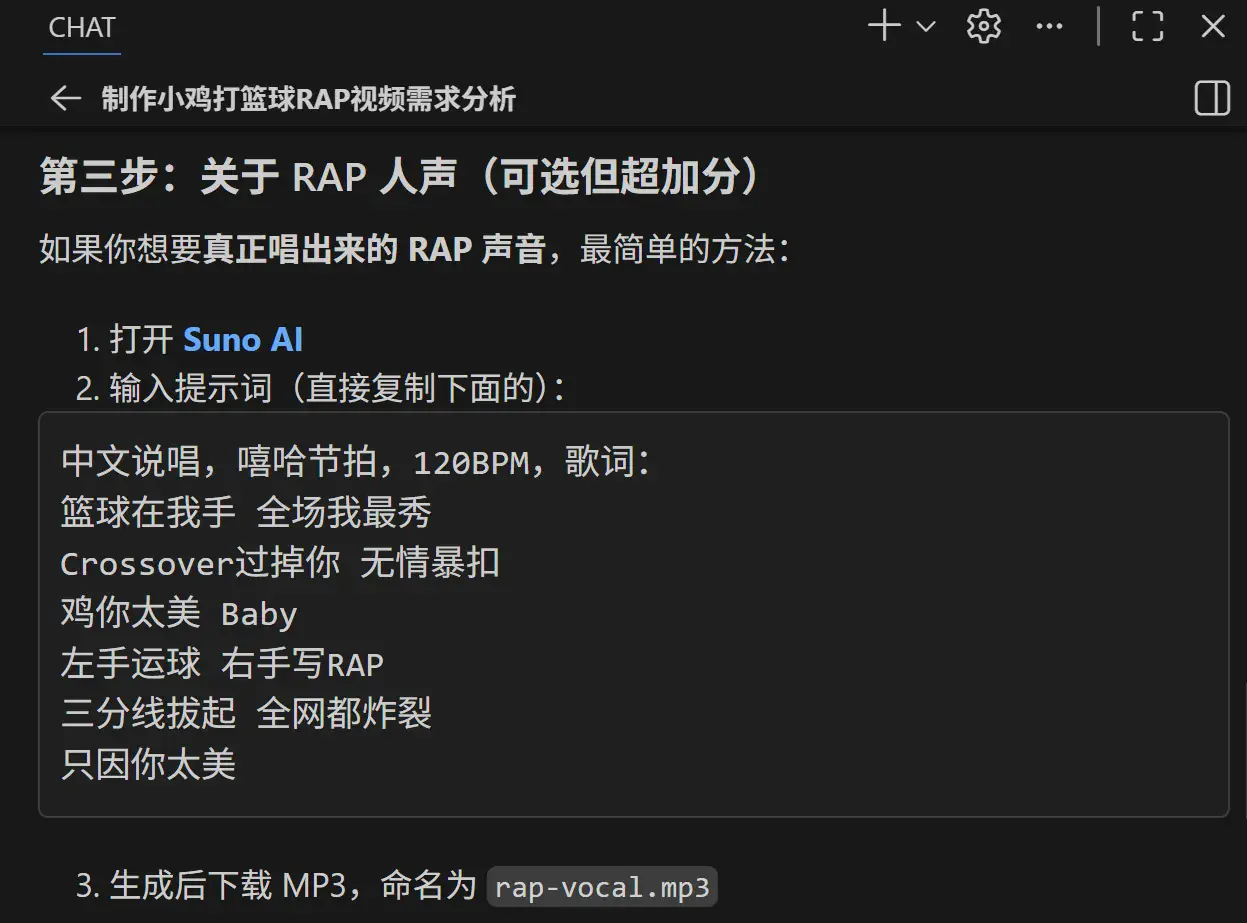 AI 推荐我用 Suno AI 来生成人声,还提供了生成人声的提示词。
