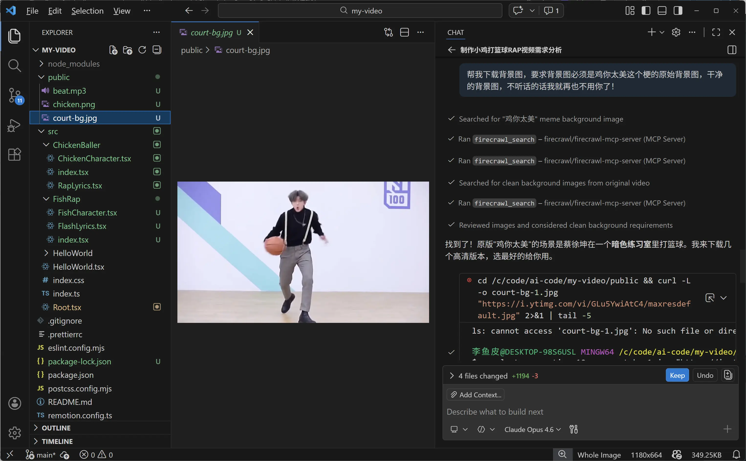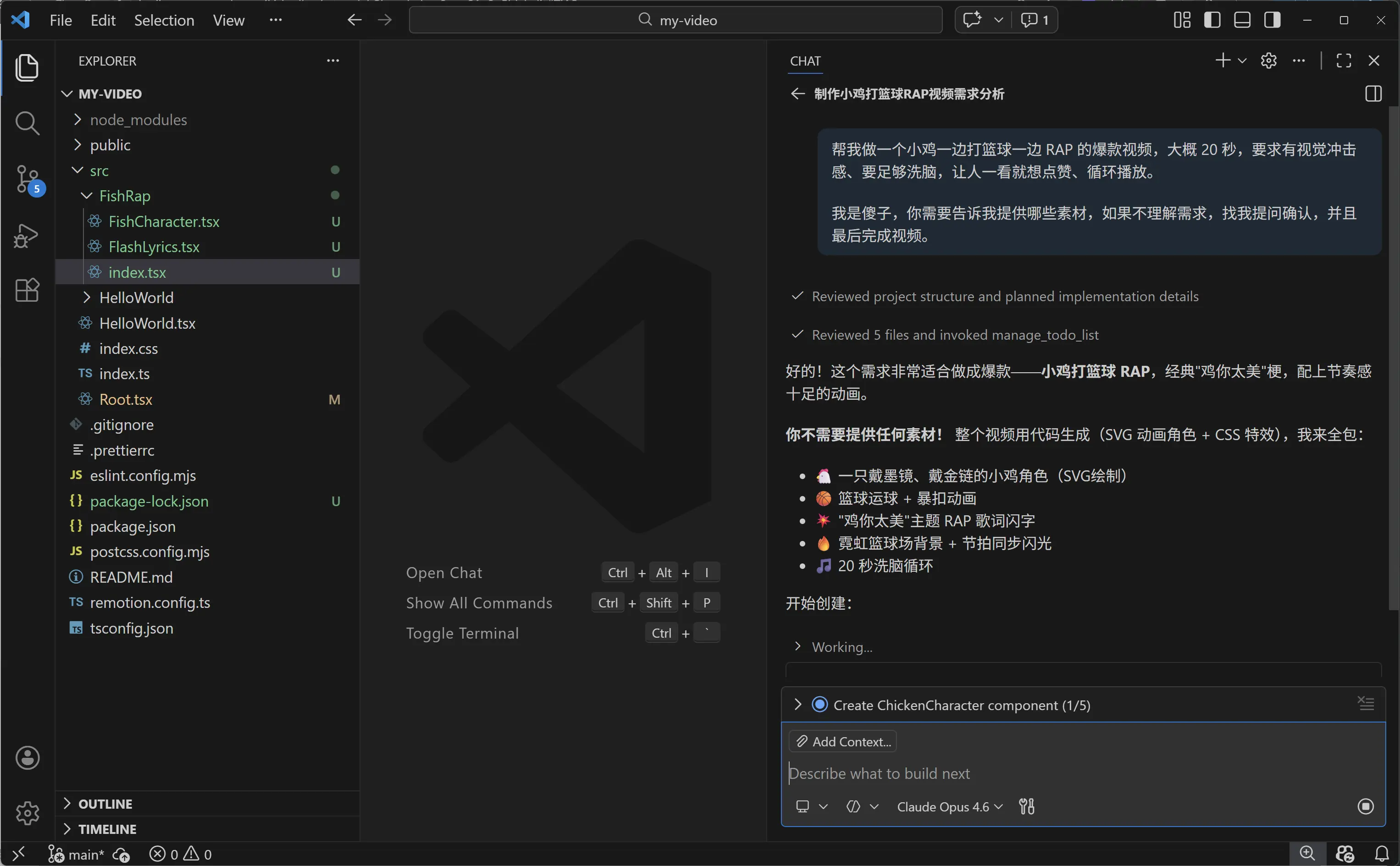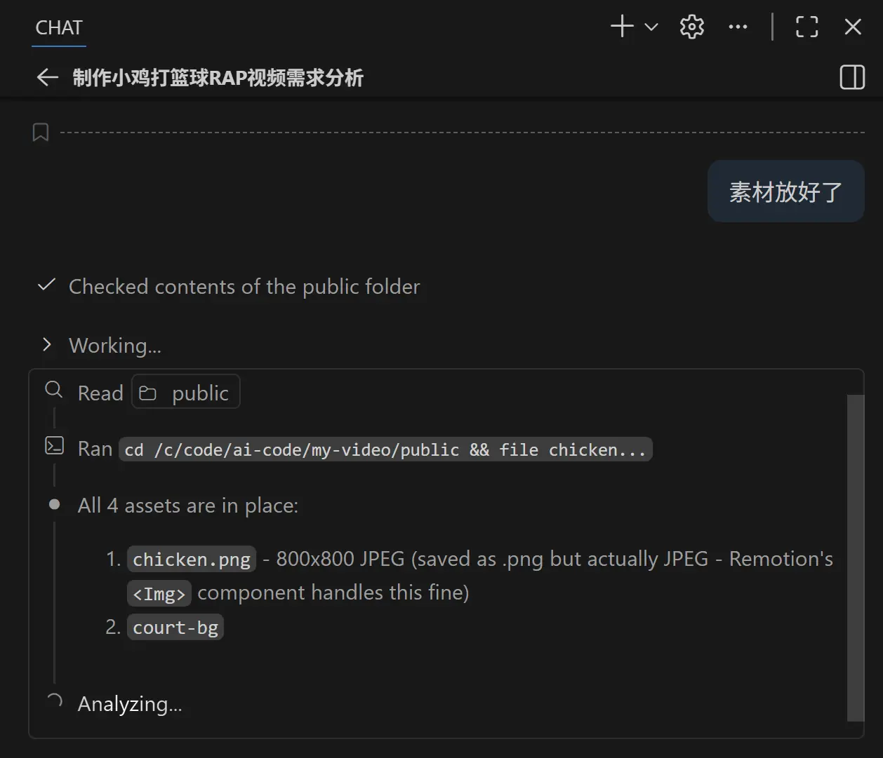 所有素材都准备好了,我把文件按照要求放到项目目录里,然后跟 AI 说: