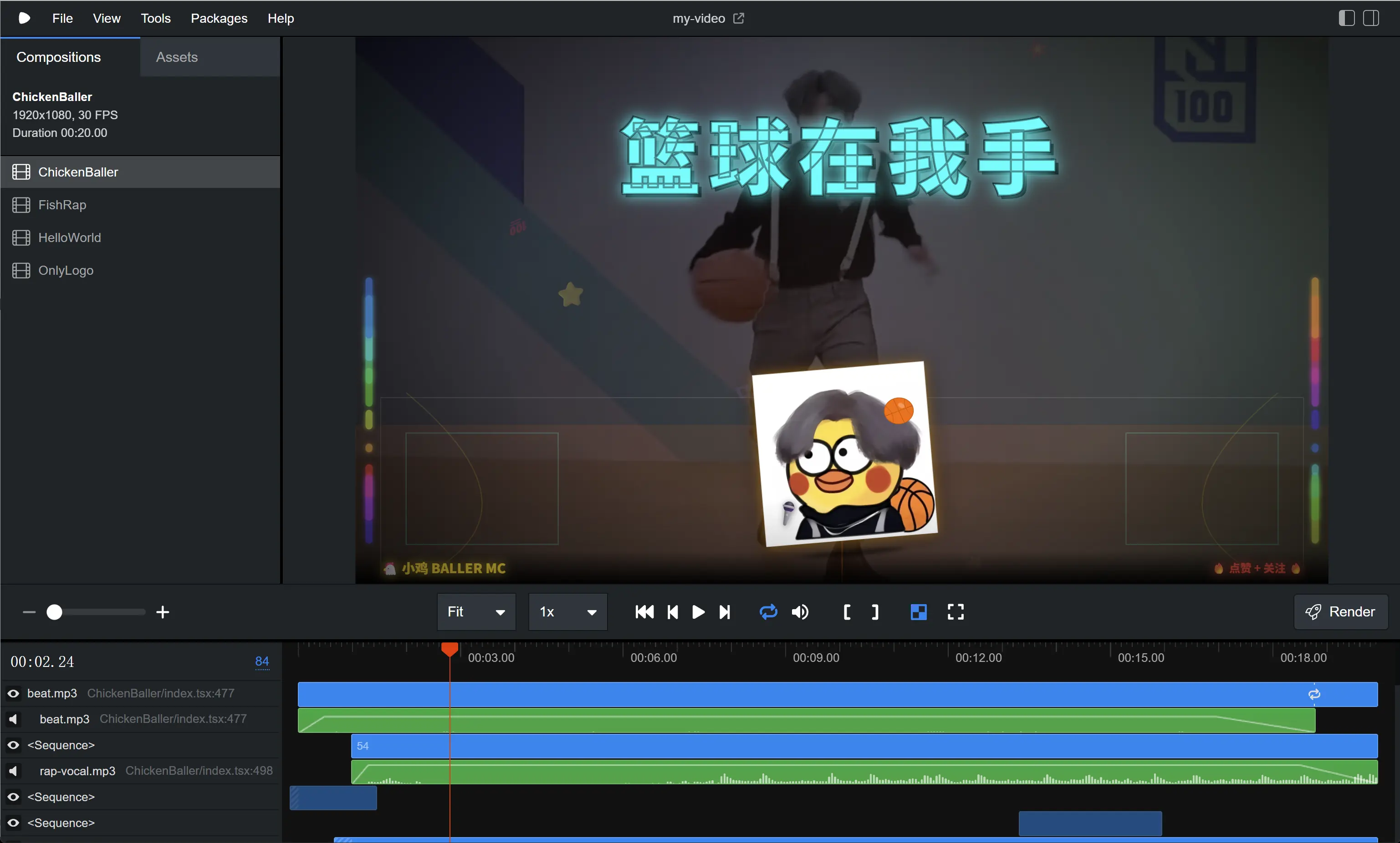 有了素材后,比之前纯靠 AI 生成 SVG 和 Emoji 的版本好了不少,背景图、背景音乐、RAP 人声、歌词动画都加上了。虽然还是有点生硬(比如中间的小鸡图片略显诡异),但整体已经有内味儿了。