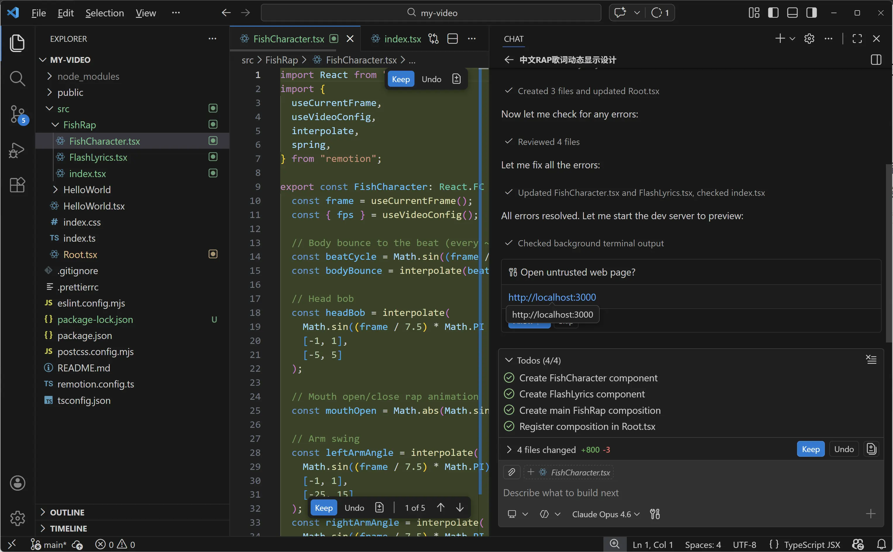你会看到,AI 直接找到了我们之前安装的 Remotion Best Practices 技能包,它会让 AI 知道怎么用编程的方式做动画。