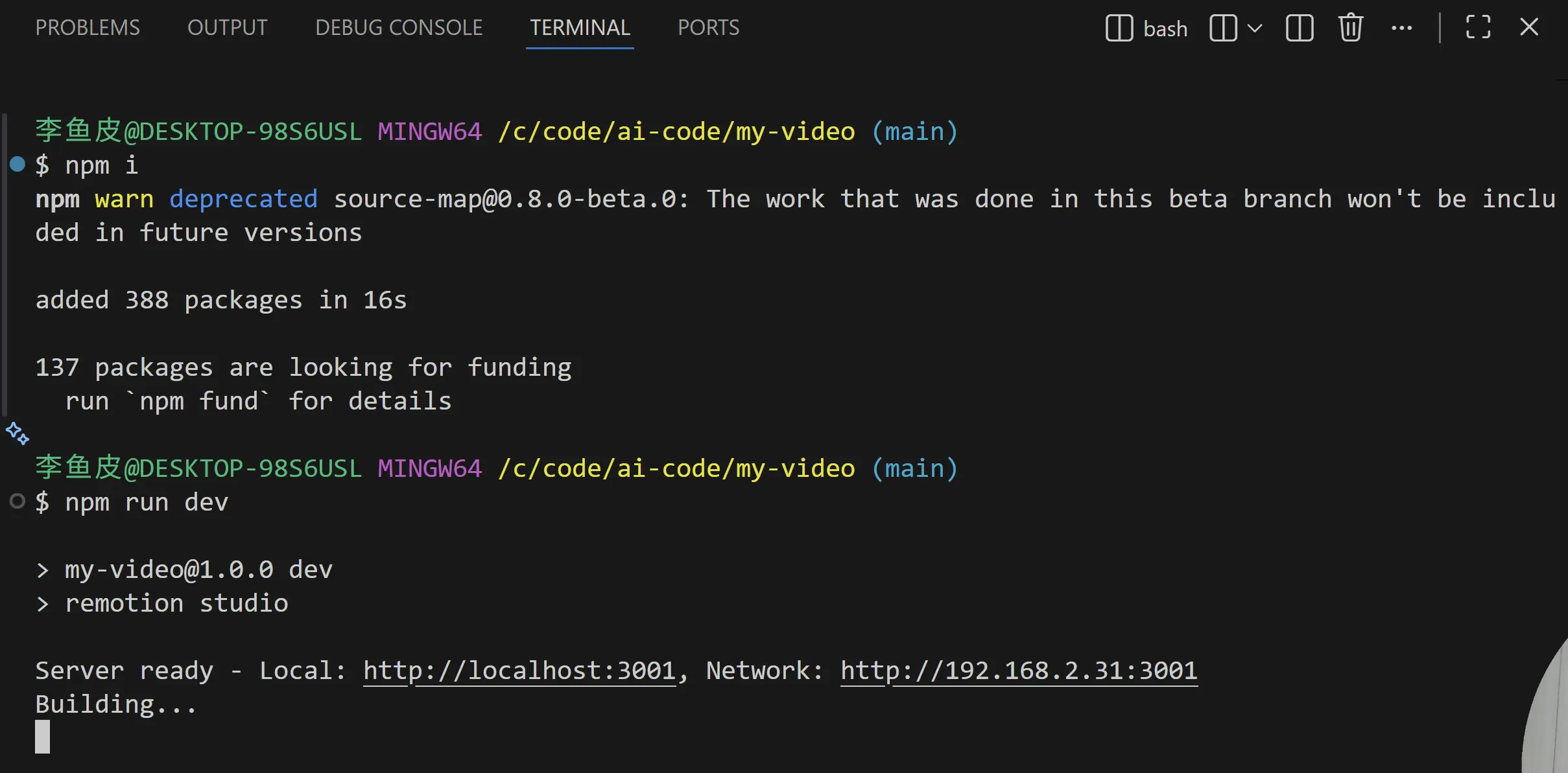 首先,打开终端,输入一行命令快速安装 Remotion: