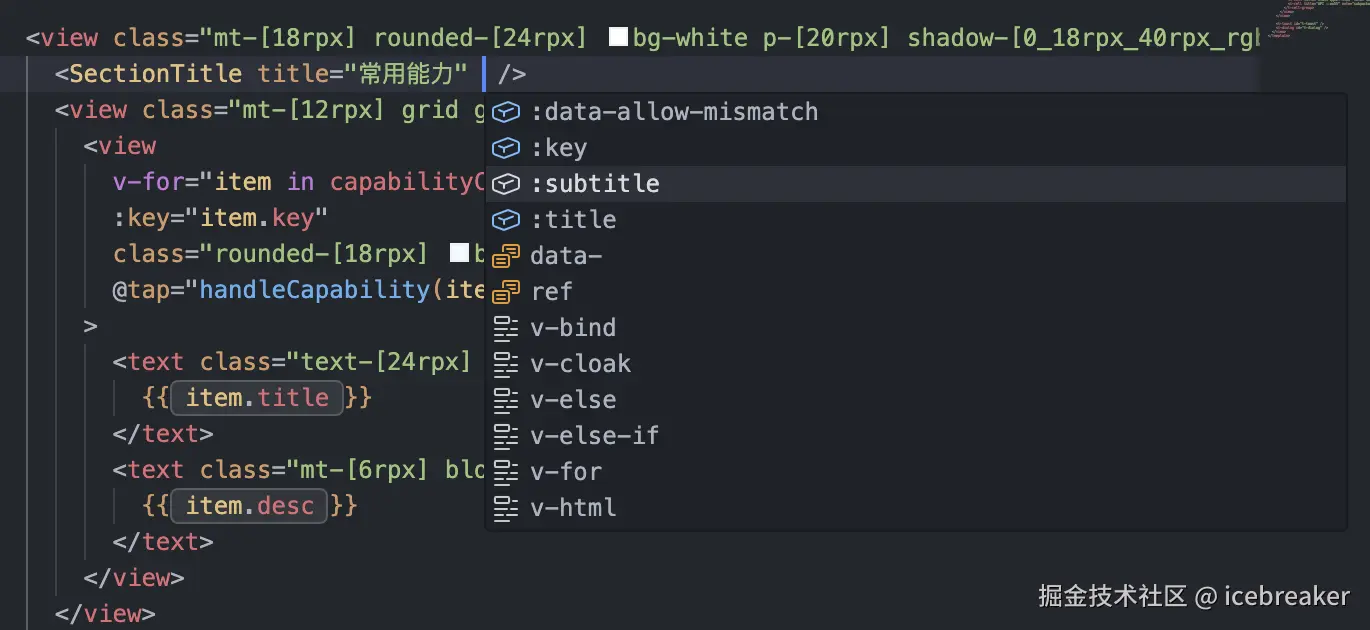 v-for场景下的:key等属性补全:class/:style等常用绑定提示- 组件属性与事件相关补全