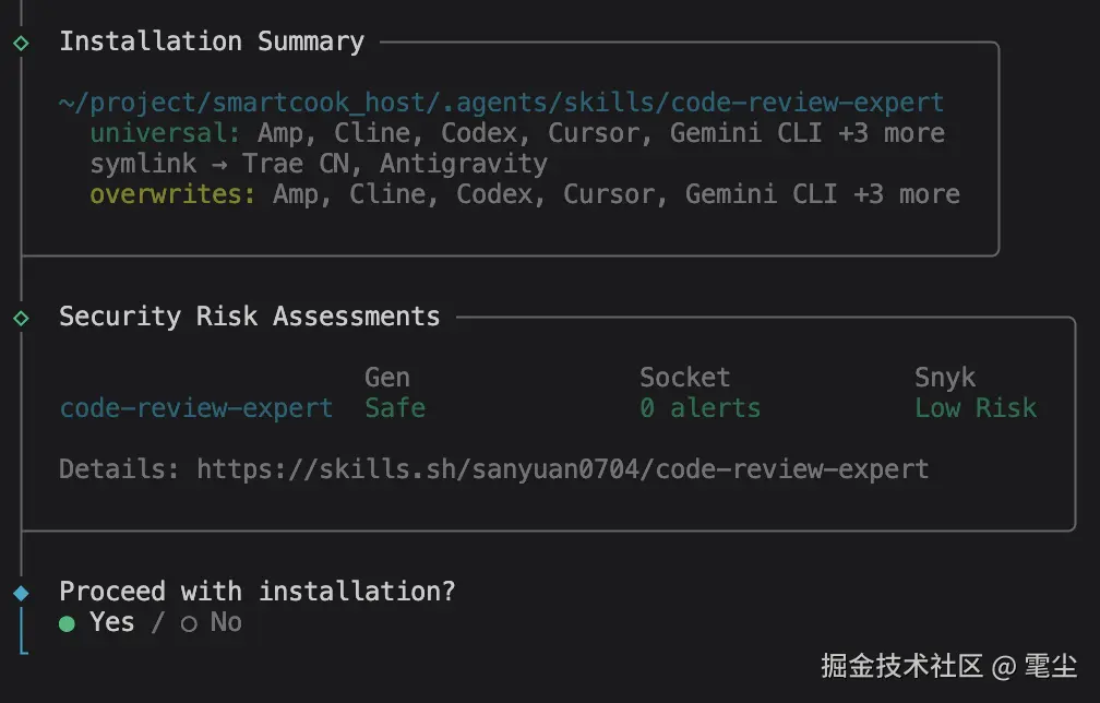 如果你选择多个 IDE,比如把 Antigravity 加上,就可能会多一个文件夹出来,如多一个.agent 文件夹,因为不同的 IDE 读取 Skills 可能是不一样的, skills 库为了兼容处理,会创建多个文件夹。