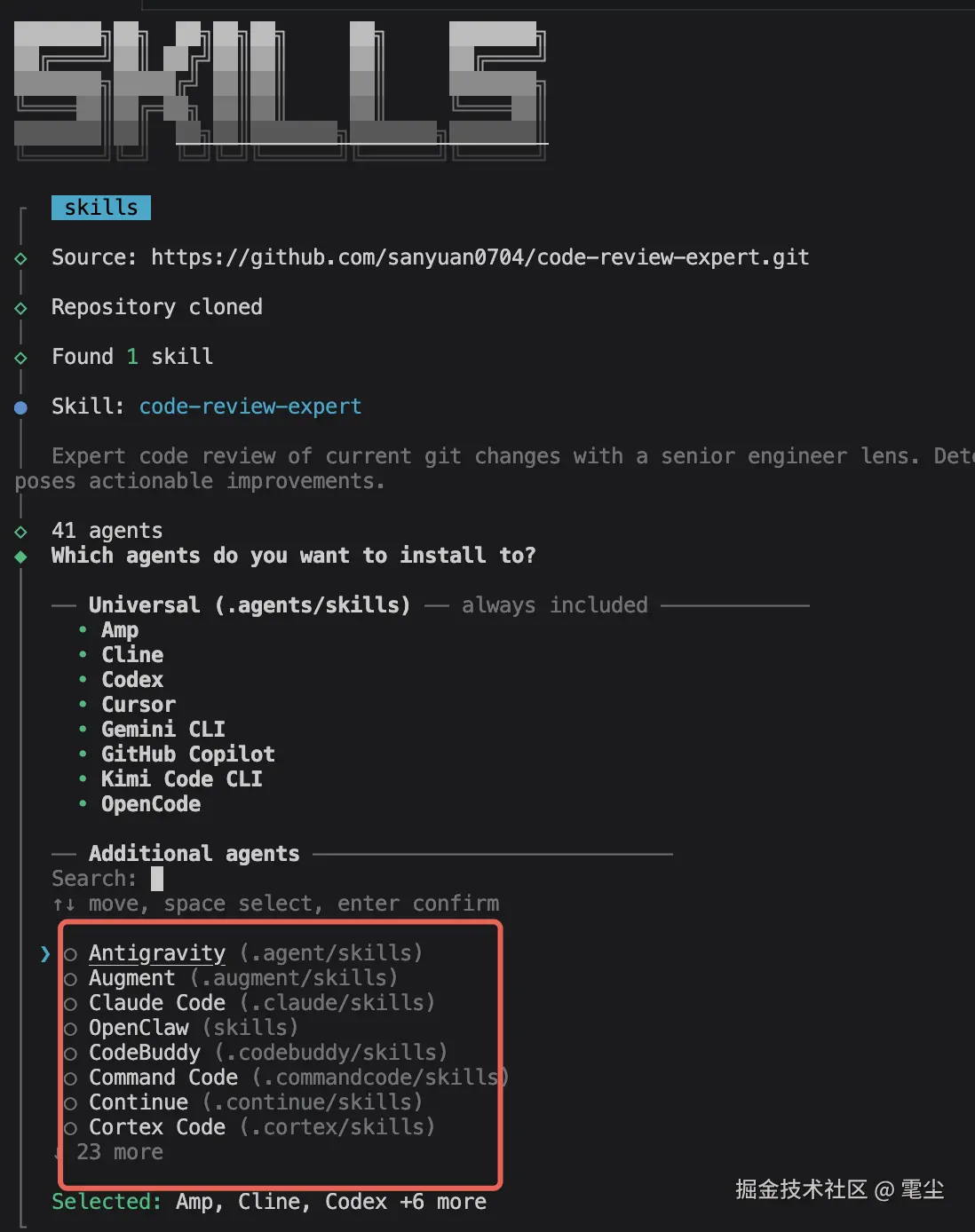 首先会让你选择给哪个 AI Agent 安装,市面上常见的 IDE/Agent 基本都已涵盖。下次再运行会记住你这次的选项: