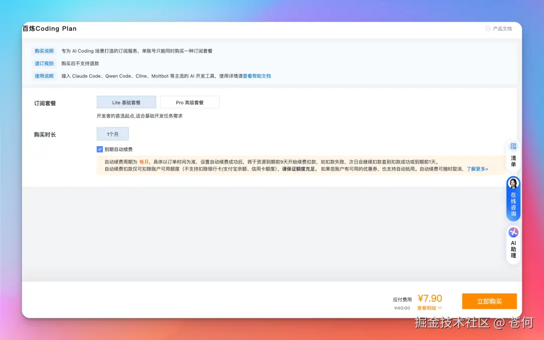 如果你也在用 OpenClaw 或者其他 AI 编程工具,强烈建议去体验一下阿里云 Coding Plan,首月的优惠力度真的很大,薅完再说。