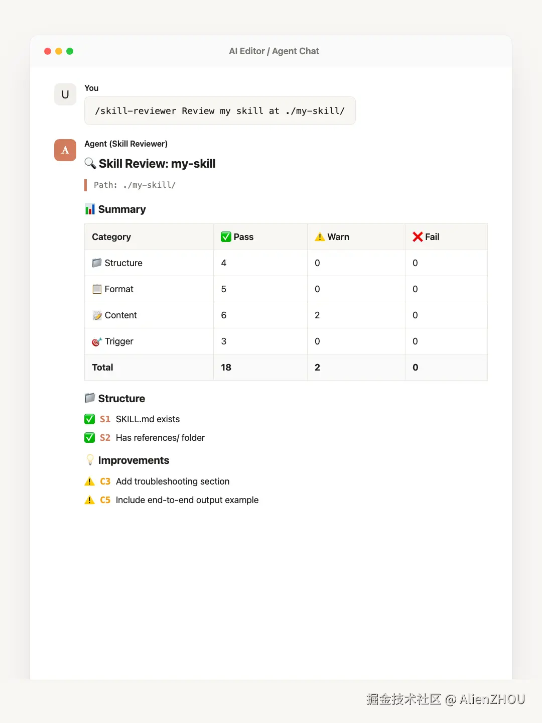 请使用 /skill-reviewer skill 检查 [你的 Skill 路径]