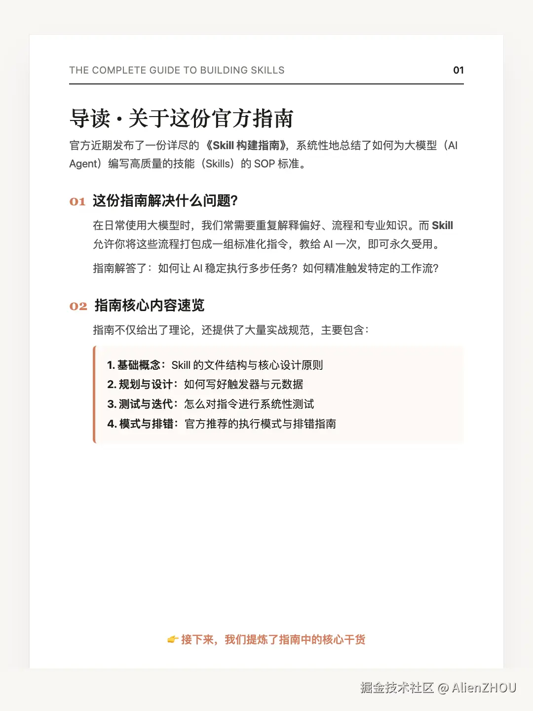 Claude 官方发布了一份 30+ 页的《The Complete Guide to Building Skills》,我翻译整理了中文版,本文先提炼下核心,大家可以速览。