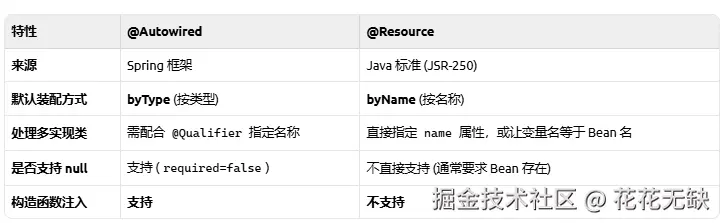 - 字段注入: 如果你的 Bean 只有唯一的实现类,使用 @Autowired 或 @Resource 都可以。 如果已知某个接口有多个实现类,且你需要指定具体的一个,使用 @Resource(name="...") 代码会更简洁(比 @Autowired + @Qualifier 少写一行注解)。