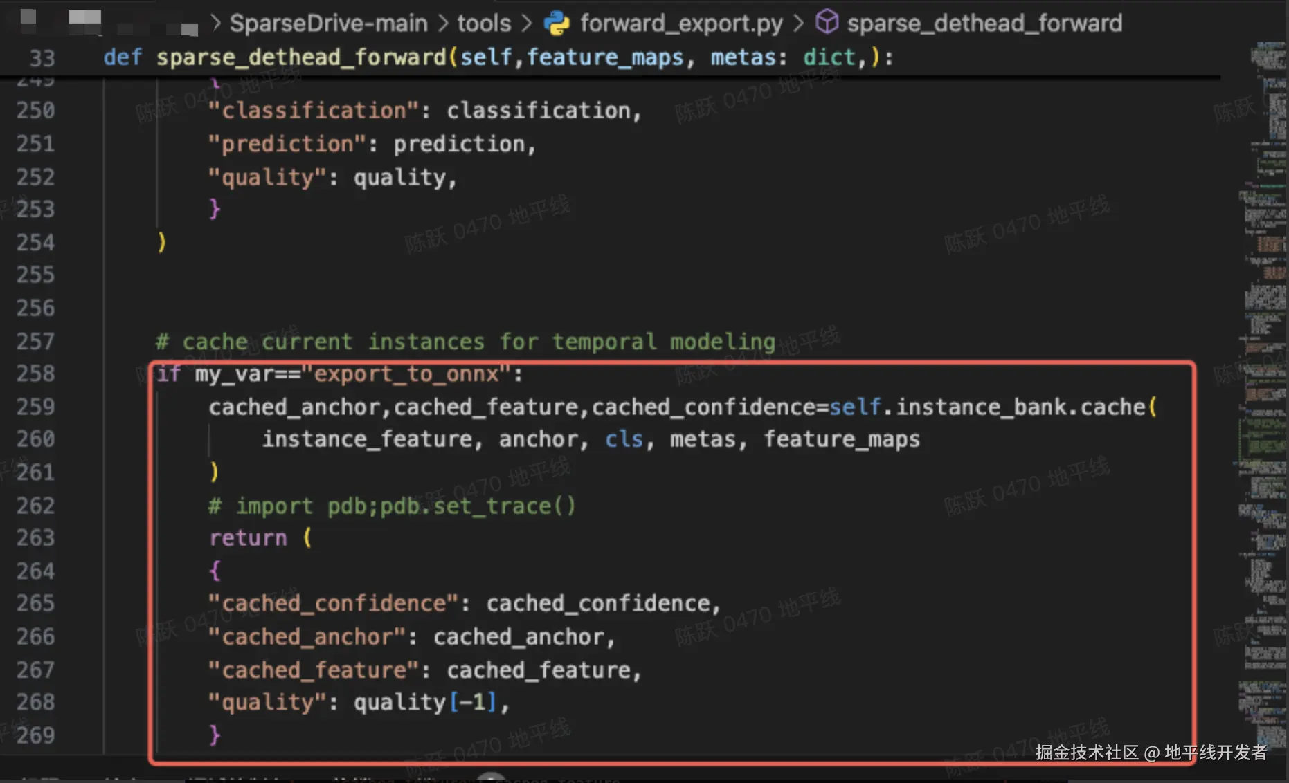 在 tools 文件夹下构建 forward_export.py,重写 sparsedrive、det_head 和 map_head 的 orward 函数,如下所示: