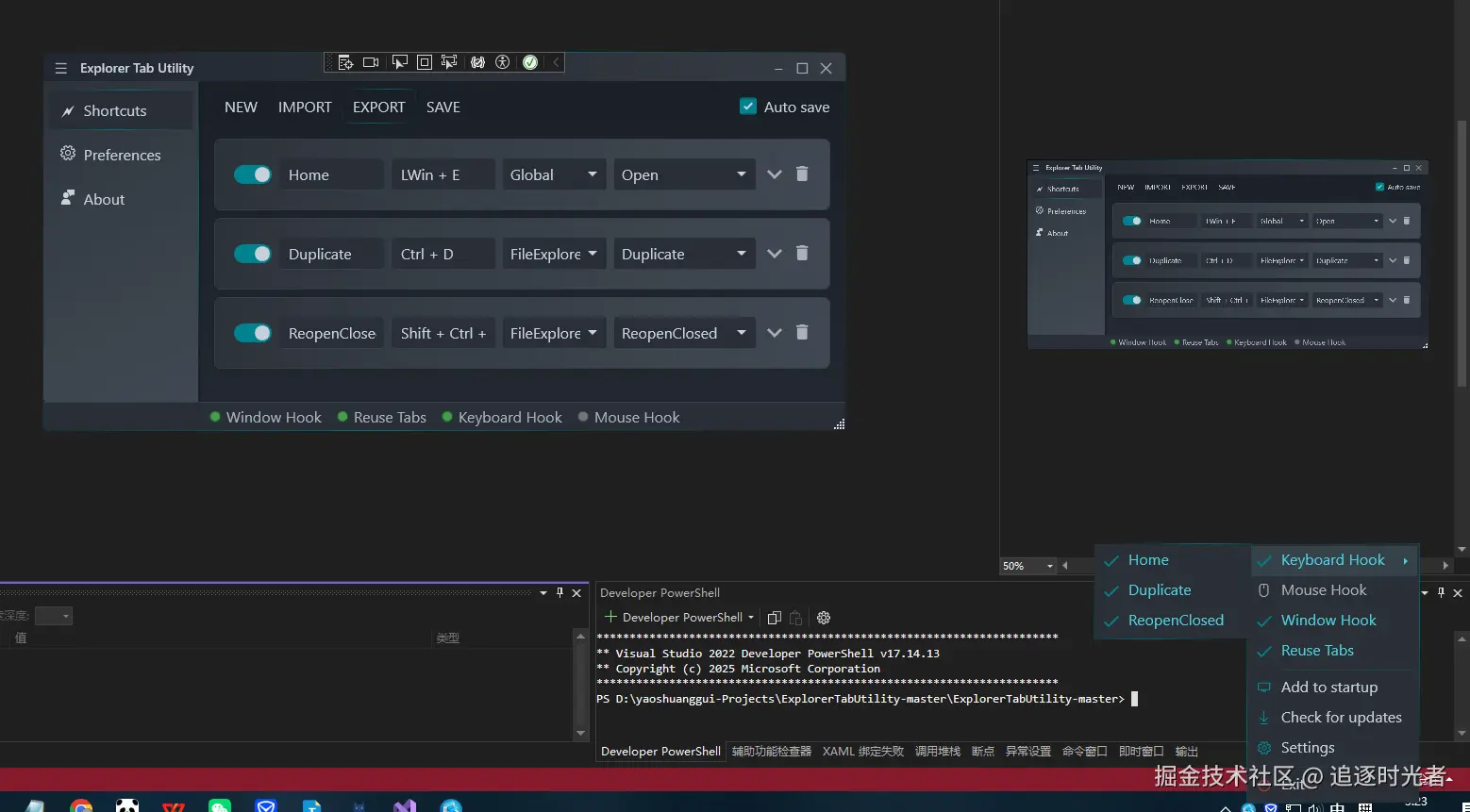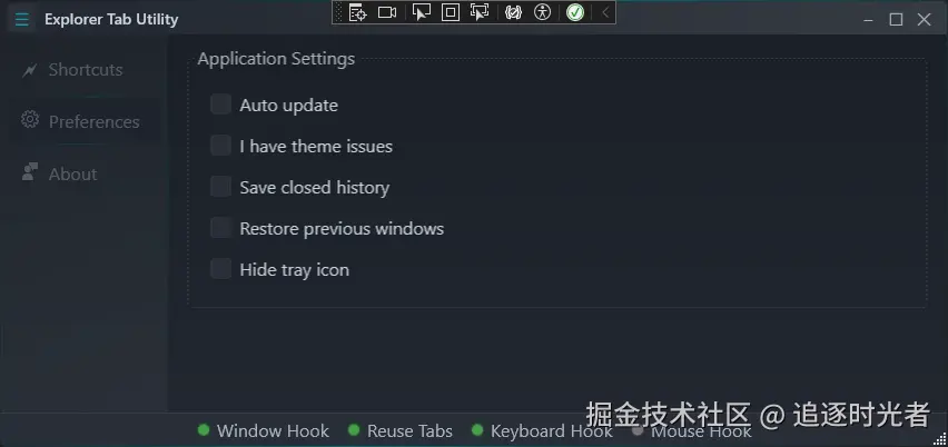 ExplorerTabUtility 是一款使用 C# 编写专为 Windows 11 文件资源管理器设计的增强型工具,开源免费(MIT license),旨在解决原生标签页功能在多窗口管理和工作流组织方面的不足。该工具通过系统级集成与 COM 接口交互,实现了对文件资源管理器窗口行为的精细化控制,显著提升用户在高频文件操作场景下的效率与体验。