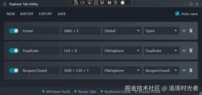 - 支持链式动作配置(例如:Ctrl+Q → 分离标签 → 原窗左贴 → 新窗右贴)