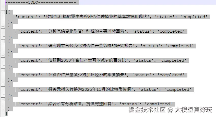 messages(包含对话历史和最终答案),还会发现一个新增的todos字段。这个字段中包含了Agent对原始任务进行拆解后的详细子任务列表。每个子任务条目都包含content(任务描述)和status(状态)。子任务的状态共有三种: