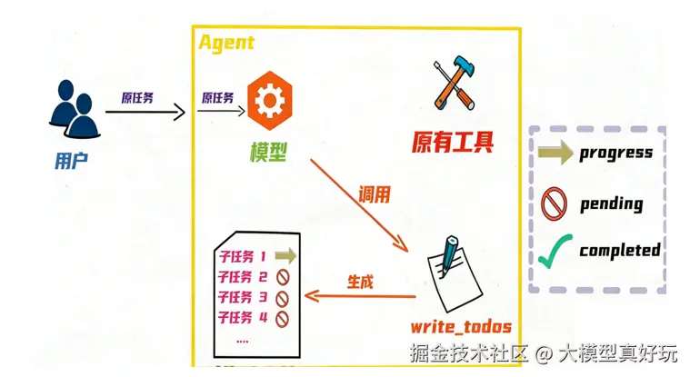 Todo List中间件的设计正是为了赋予Agent这种规划能力。它的实现方式与传统钩子函数不同,而是以额外工具 的形式,向Agent注入一个名为write_todo的工具。其工作流程如下: